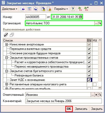 Ашылған тізімде жаңа «Айдың жабылуы» құжатын құрыңыз. Ол үшін батырмасын ( немесе «Әрекет» менюіндегі «Қосуды» тандау арқылы немесе “Insert” пернесін) таңдаңыз. Құжатта айдың соңғы күнін белгілеңіз (мысалы 31.01.2006).