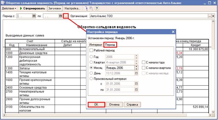 2.Есеп берудің керекті мерзімін бекіту үшін «Мерзім (период)» өрісінің оң жағындағы пернені басыңыз. Ашылған терезеде суретте көрсетілгендей есеп берудің мерзімін бекітіңіз. Мерзімді баптау терезесінің төменгі бөлігіндегі «ОК» батырмасын басыңыз. Есеп берудің басқару тақтасындағы «Қалыптастыру» батырмасын басыңыз.