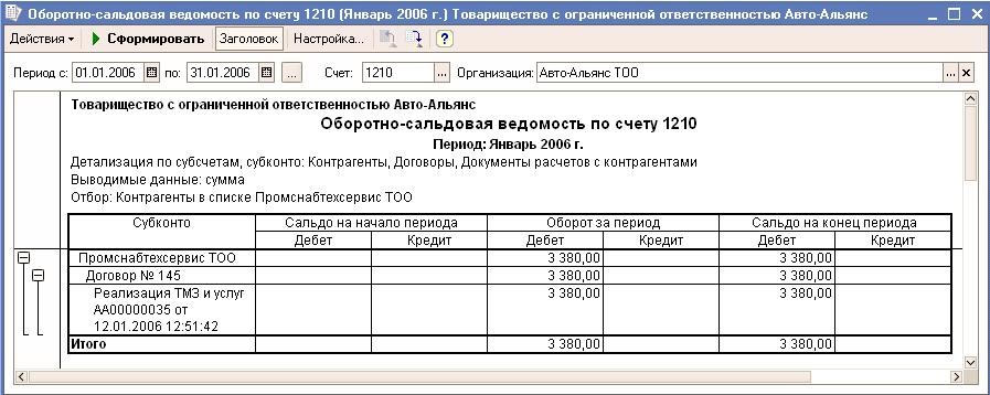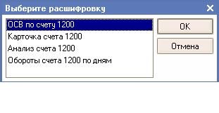 3.Айналымды-сальдо ведомосін қараған кезде керекті шот бойынша терең ақпарат алуға болады. Егер шот жазылған жолды тышқан пернесімен екі рет сырт еткізсе, компьютердің экранында берілген шот үшін құрылған бірнеше есеп берудің біреуін таңдау үшін тізім шығады, мысал, «Шот бойынша айналымды-сальдо ведомосі».