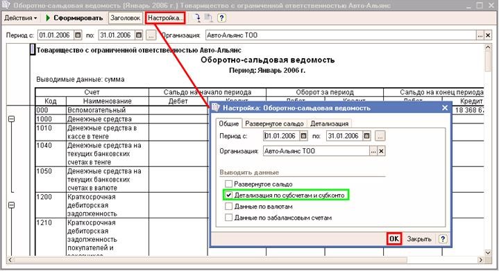 Субшоттар бойынша есеп берудің мәліметтерін бөлшектендіру үшін «Баптау» батырмасын басыңыз және баптау терезесінде «субшоттар мен субконто бойынша бөлшектендіру» жалауын бекітіңіз. Баптау терезесіндегі «ОК» батырмасын басыңыз.