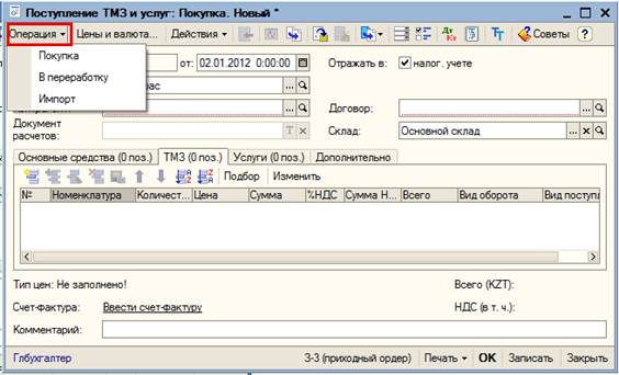 Шарушылық операцияның бірнеше түрінің тіркеуі үшін бірі – құжат арнаулы болуы мүмкін. Әр түрлі операцияларға сәйкес әр түрлі жазылған деректердің жинақтары және құжат рәсімдеу ережелері әр түрлі болады. Сол себептен шаруашылық операцияның көрінісін алдын ала орнату керек, толтыру алдында құжаттың Операция пішінінің әмірлі панеліне құжатты тандау керек. Мысалы, ТМҚ құжатының түсімі және қызмет атқарулардың шаруашылық операцияның бірнеше түрлеріне арналады: сатып алуға, өңдеуге, импортқа, 13-суретте көрсетілгендей.