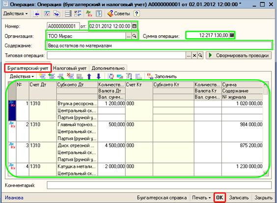 Барлық проводкаларды енгізгеннен кейін, шаруашылық операцияға қатысты, Ок кнопкасын басу керек. Операция нысанының астындағы (бухгалтерлік және салым есеп) операцияны жазу және жабу формасы үшін.