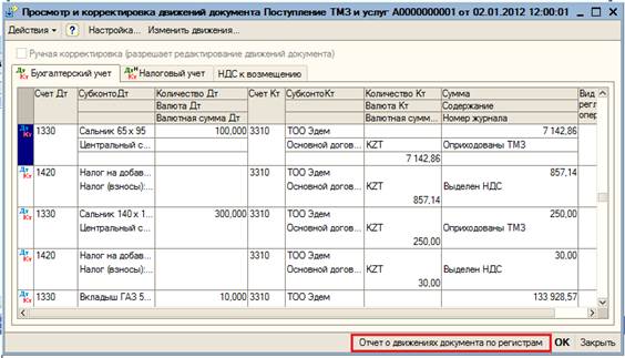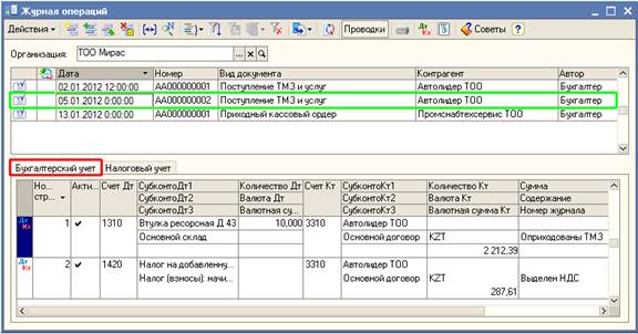 Операцияның журналының төменгі бөлігінде ерекшеленген операциясында көрсетеді. Проводкалар бухгалтерлік есеп, есеп алымның проводкалары, Салық есебі закладкасында қамтылады.