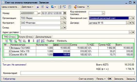 Осы үшін Жаңа қоймны құру керек. Жаңа қойманы құру үшін (Қосу) батырмасын немесе Insert батырмасын немесе әрекеттің дастархан мәзірін - таңдап алыңыз) түймесінің басыңыз. Деректеменің мағынасының қоймаларын(сақта- жерлері) солай сияқты суретте көрсетілгендей ТМҚ закладкасында тауарларды сілтеп жиынтықтың тізбесінен бағасын кіргізіңіз. Есеп бұл ретте автоматты құжатқа деген астына қойылады.