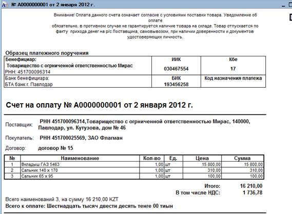 20-сурет – Төлеуге арналған шоттың басып шығату формасы