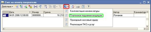 Тауарларды түсу мен қызмет көрсету төлем тапсырмасы негізінде құрыңыз.Тауар түсуін құжаттар тізімінде ол үшін бұрын жасалған құжатты ерекшеленіз және (немесе тышқаның оң батырмасынмен шертіп жіберіңіз және ашқан мәзірде негіздеуде таңдаңыз)батырмаға басыңыз. Ұсынылған тізімдеме таңдаңыз – шығатын төлем тапсырмасы.