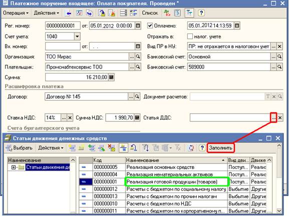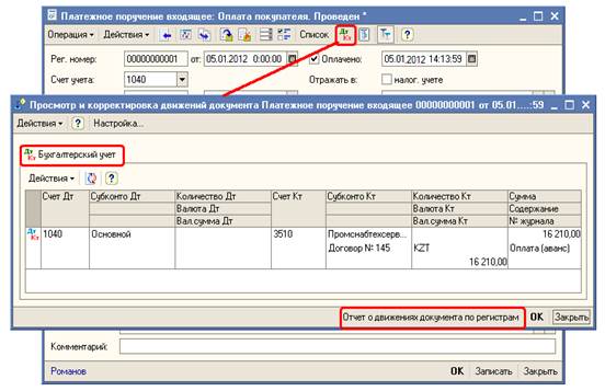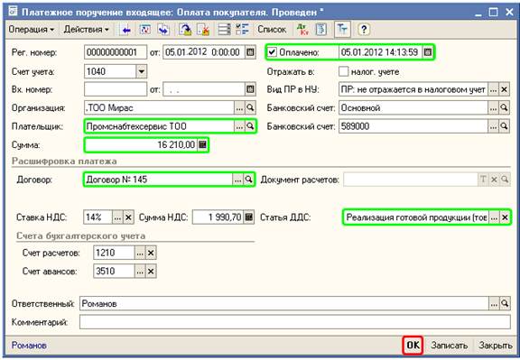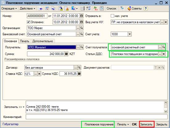 Егер жалауша орнатылмаған болса – құжат ғана жасалған ақпарат база мүмкін болса егер төлем тапсырмасы жалаушасы төленген орнатылған болса, құжаттың иә батырмасын басу кезінде есептеу бухгалтерлік жазбада құрастырады.