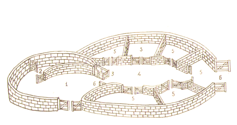 1 – главное отделение база (приемное); 2 – коридор; 3 – раскольная клетка; 4 – распределительный баз; 5 – секции база для вновь созданных косяков; 6 – ворота