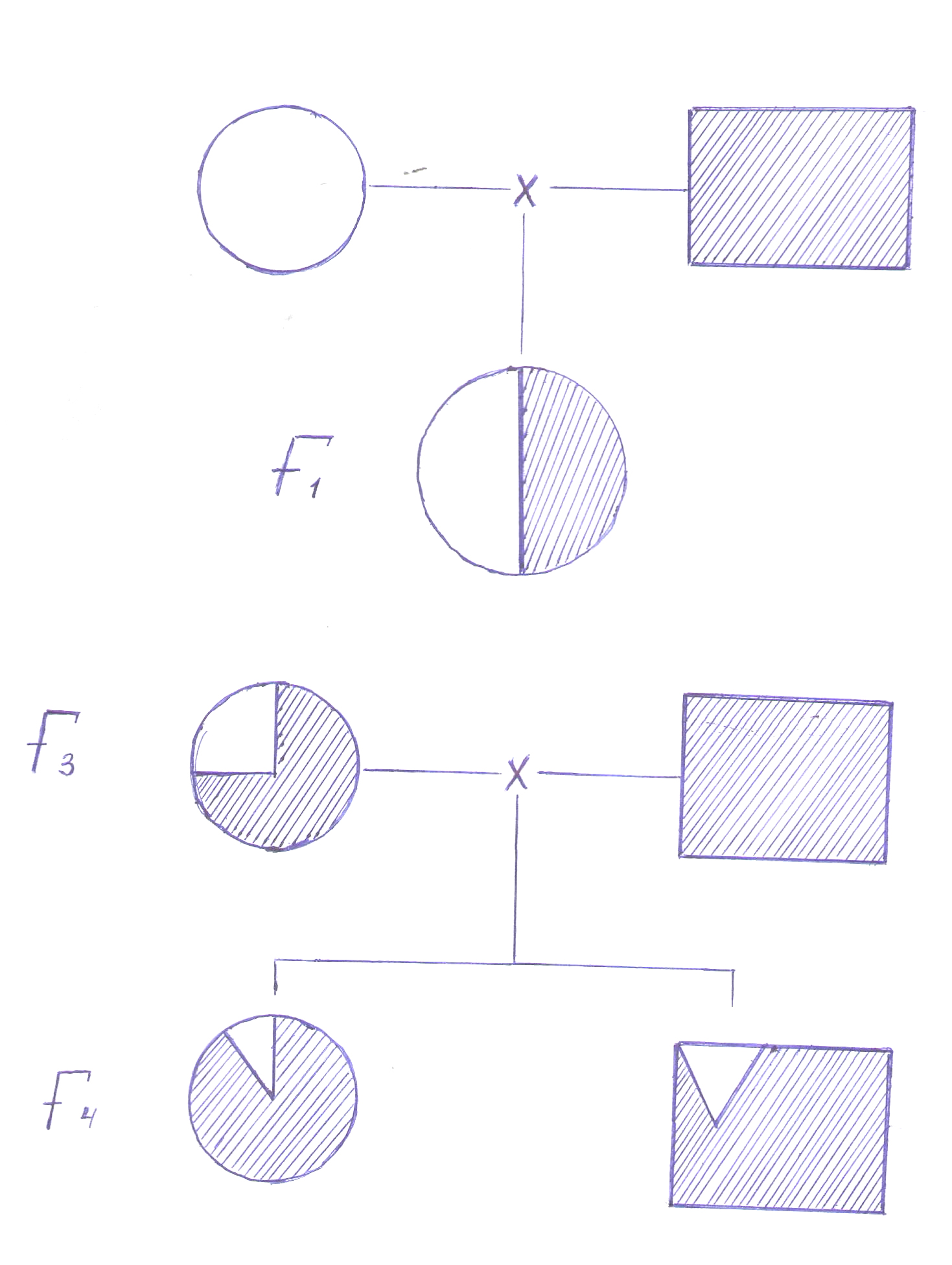 Дальнейшие расчеты кровности проводят аналогичным порядком. В схемах скрещивания принято фигуры (квадраты), обозначающие улучшающую породу, заштриховывать полностью, а фигуры, обозначающие помесей, заштриховывать частично: помесь 1-го поколения (тричетвертикровку) – на три четверти и т.д.