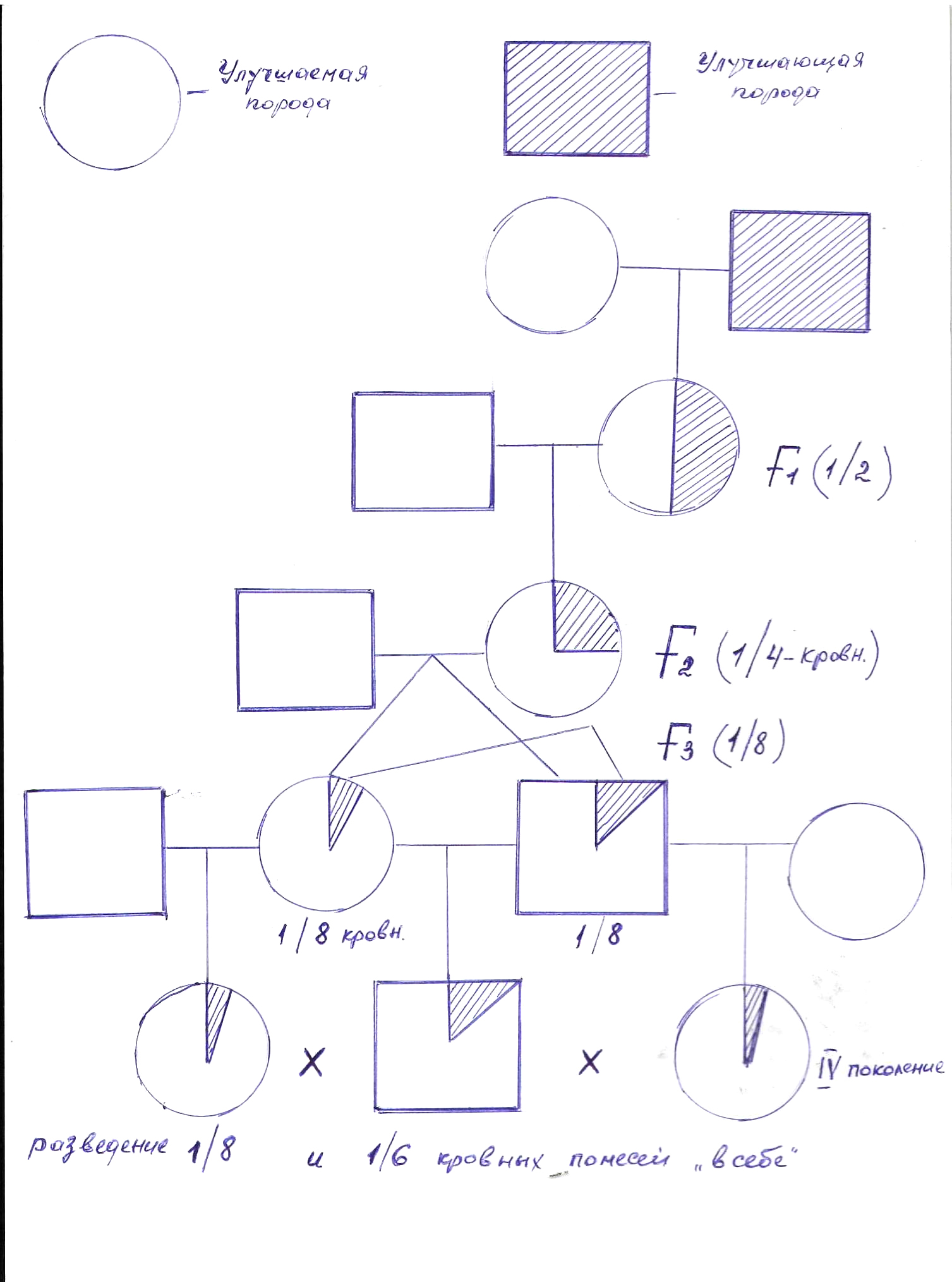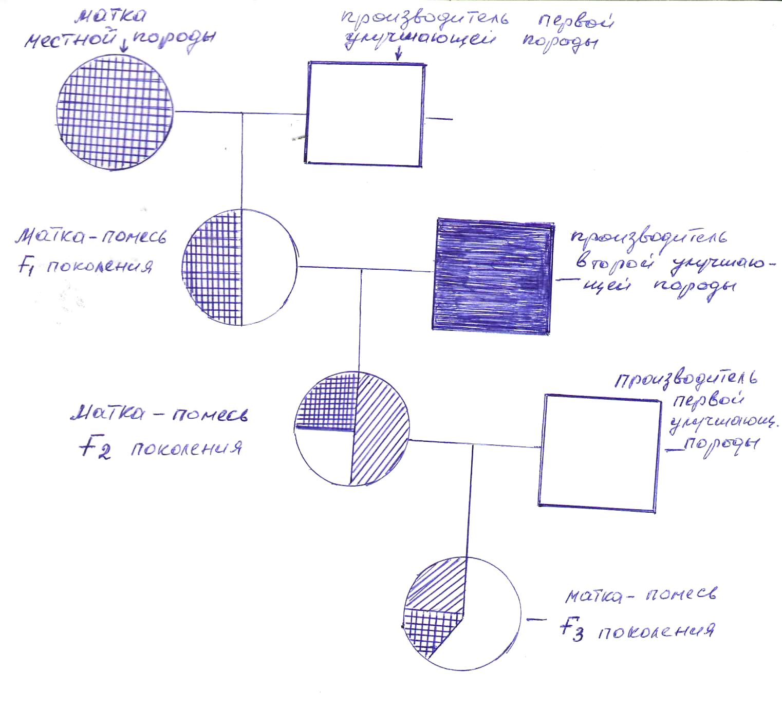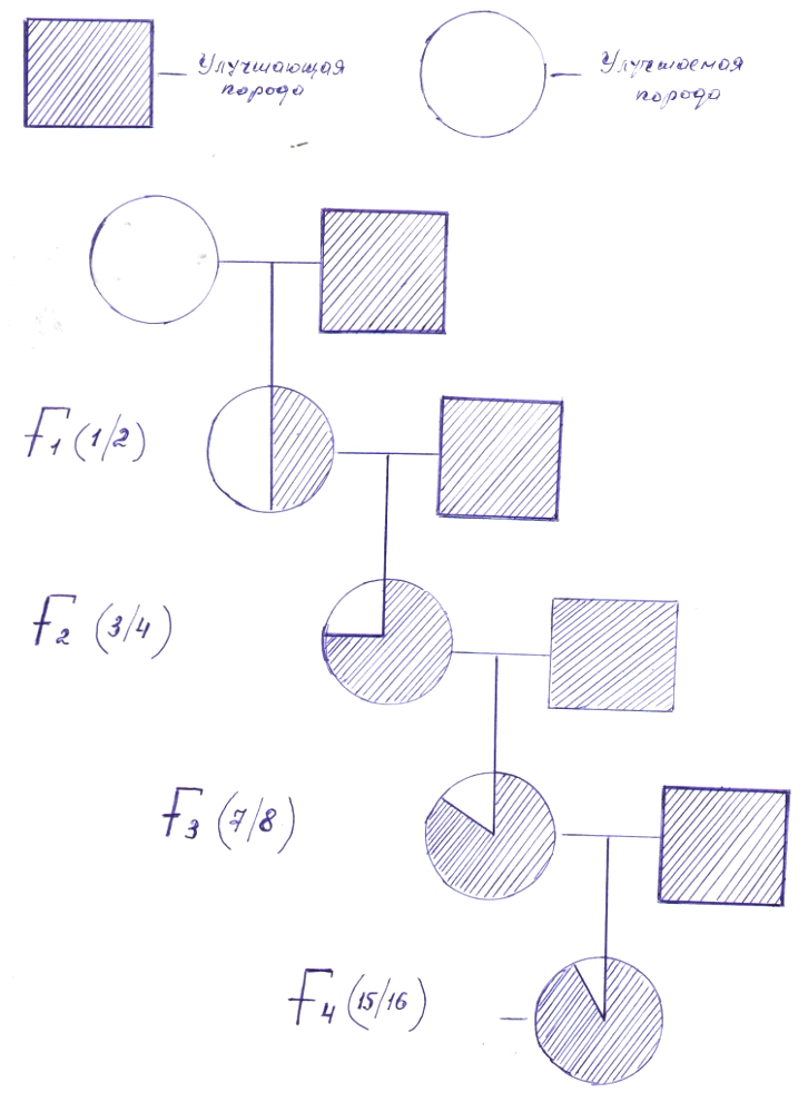 поколения, которые в дальнейшем спаривают с производителями основной улучшаемой породы, а помесных производителей желательных качеств, спаривают с матками улучшаемой породы. Таким образом, проводится как бы «прилитие крови» улучшающей породы.