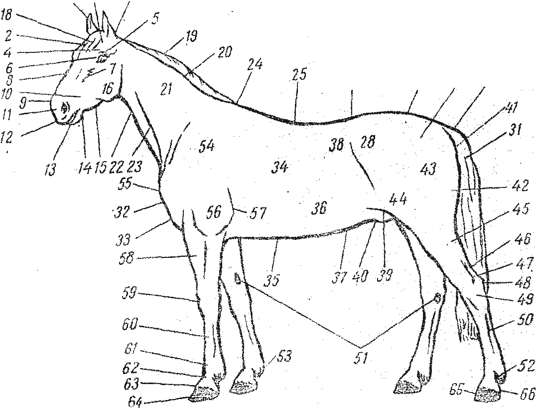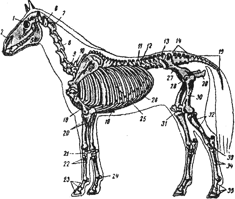 1 – лобная кость; 2 – носовая кость; 3 – резцовая кость; 4 – верхняя челюсть; 5 – нижняя челюсть; б – атлант; 7 – эпистрофей; 8 –четвертый шейный позвонок; 9 – седьмой шейный позвонок; 10 –первый грудной позвонок; 11 – последний грудной позвонок; 12 –первый поясничный позвонок; 13 – последний поясничный позвонок; 14 – крестцовая кость; l5 – хвостовые позвонки; 16 – лопатка; 17 – плечевая кость; 18 – грудная кость; 19 – мечевидный хрящ грудной кости; 20 – кости пред¬плечья (лучевая и локтевая); 21 – кости запястья; 22 – кости пясти (пястная и грифельная); 23 – фаланги пальца (кости – путовая, венечная и копытовидная); 24 – сезамовидные кости; 25 – ребра; 26 – реберные хрящи; 27 –подвздошная кость; 28 – лонная кость; 29 – седалищная кость; 30 –бедренная кость; 31 – коленная чашечка; 32 – кости голени (большеберцовая и малобер¬цовая) 33 – кости заплюсны; 34 – кости плюсны (плюсневая и грифельная); 35 – фаланги пальца задней ноги.