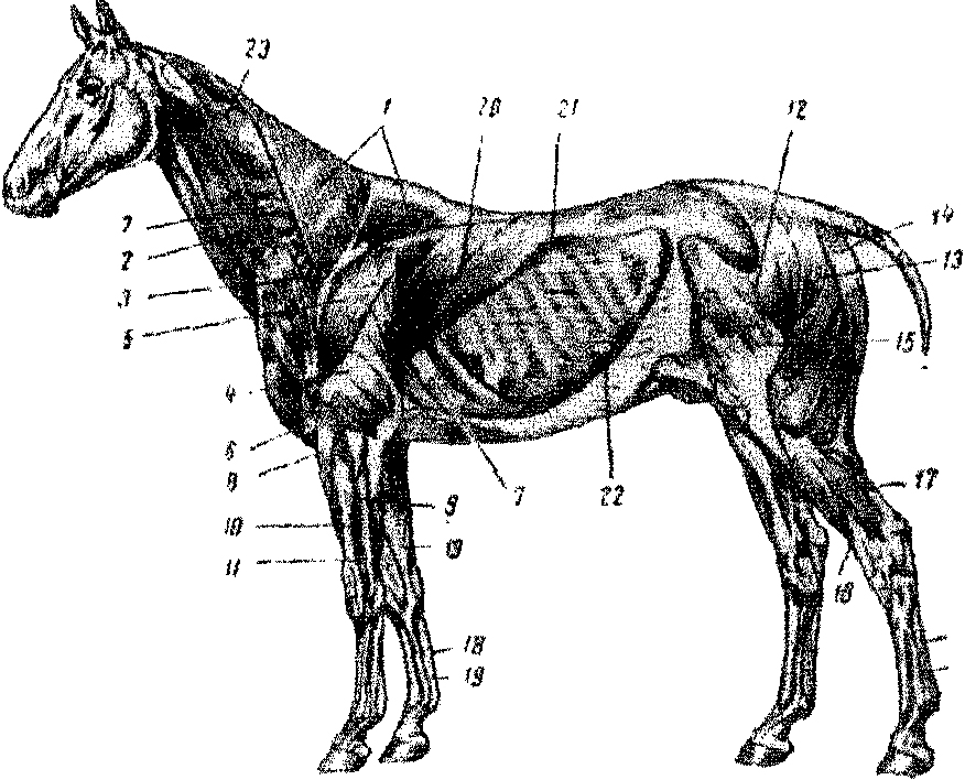 l – трапецевидный мускул; 2 – плечеголовной мускул; З – предостный мускул; 4 – трехглавый мускул плеча; 5 – дельтовидный мускул; б – плечевой мускул; 7 – вентральный зубчатый мускул; 8 – лучевой разгибатель запястья; 9 – локтевой разгибатель запястья; 10 – общий пальцевый разгибатель; 11 – боковой пальцевый разгибатель; 12 – группа ягодичных мускулов; 13 – двуглавый мускул бедра; 14 – полусухожильный мускул; 15 – напрягатель широкой фасции бедра; 16 – длинный пальцевый разгибатель; 17 – боковой пальцевый разгибатель; 18 – поверхностный пальцевый сгибатель на грудной и тазовой конечностях; 19 – глубокий пальцевый сгибатель на грудной и тазовой конечностях; 20 – широчайший мускул спины; 21 – дорсальный зубчатый мускул; 22 – наружный брюшной косой мускул; 23 – пластыревидный мускул.