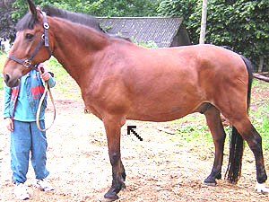 Провислость бабок (мягкость, медвежьи бабки). В результате конституциональной слабости сухожильно-связочного аппарата у лошадей могут наблюдаться мягкие ("медвежьи"), провисающие при движении бабки. Предрасполагающей анатомической причиной в данном случае являются чрезмерно длинные и косо поставленные путовые кости. Недоразвитость лошади и рахит – главная причина появления непропорционально длинных бабок и ослабления связочного аппарата. У старых, одряхлевших лошадей в связи с общим ослаблением связочного аппарата с возрастом часто наблюдаются мягкие бабки, так же как и мягкая, провислая спина. Особенно строгий подход при определении степени порочности мягких бабок должен быть в отношении молодых лошадей. Чтобы определить, имеются ли у лошади мягкие бабки, ее необходимо осмотреть на движении шагом и рысью