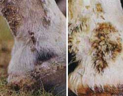 | Мокрецы (дерматит) | Гнойное воспаление кожи под щетками, спереди скакательных и сзади запястных суставов. |