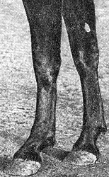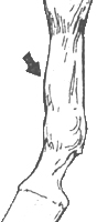 Букшины. Опухоли спереди пясти или плюсны. Появляются в результате воспаления и утолщения (периостит) надкостницы в области сухожилия – разгибателя. Воспаление надкостницы, выпуклое утолщение спереди пясти вследствие напряженной тренировки и испытаний, особенно по жесткому грунту. Оно может также привести к воспалению сухожилия, что вызовет хромоту. Букшины чаще всего появляются у молодых лошадей при интенсивной тренировке и испытаниях. Вначале они очень болезненны, но излечиваются, хотя следы их остаются, нарушая сухость и очерченность ноги. Первейшим лечением является покой.