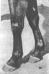 Мокрецы (подседы). Воспаление кожи с мокнущей сыпью под щетками задних или передних ног (встречается спереди скакательного сустава или сзади запястья). Развиваются мокрецы от содержания конечностей лошади в сырости. При злокачественном мокреце волосы, покрывающие нижнюю часть ноги, приобретают вид щетки ("ежовая нога"), на ноге возникают флегмоны, и вся нога отекает ("слоновая нога").