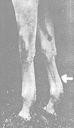 | Слоновость ног | Диффузное (разлитое, объемное) опухание с уплотнением кожи и подкожной клетчатки плюсны и других частей конечностей в результате дерматита. |