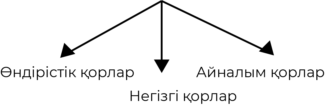 Еңбек құралдары(машиналар, құрал-жабдықтар) жасап шығарады. Өндіріс құралдарының баға формасын шығару, кәсіпорынының өңдіріс қорлары болып табылады. Олардың өндіріс протцесіндегі жұмыс істеуіне байланысты, оларды дайын өнімнің бағасына көшіру тәсілінде және еңбек құралдарының өндіру сипатын және еңбек нысанының негізгі және өнделген қорлар ажыратады. Негізгі өндірістік қорлар, өндіріс қорларының бір бөлігі. Ол өндіріс үрдісінде ұзақ уақыт қатысады. Ал оның бағасы дайындалатын өнімге біртің-біртің бөліктермен қолдану тәсіліне қарай көшіріледі. Олар капитал салумен толтырылады. Өндіріс қорларымен қатарлас, өндірістік емес негізгі қорлар бар. Бірақта өндіріс протцесіне қатыспайды, сонымен қатар өздерінің бағасын өнімге тасымалдамайды. Өндірістік емес негізгі қорлардың өндіріс көлеміне, еңбек өндірісінің өсуіне пайда болған зиянға қарамастан, бұл қорлардың әрдайым өсуіне, жұмыскерлердің жағдайының жақсаруына материалды-мәдени өмірдің көтерілуіне, кәсіпорынның іс әрекетінің нәтижесіне байланысты.