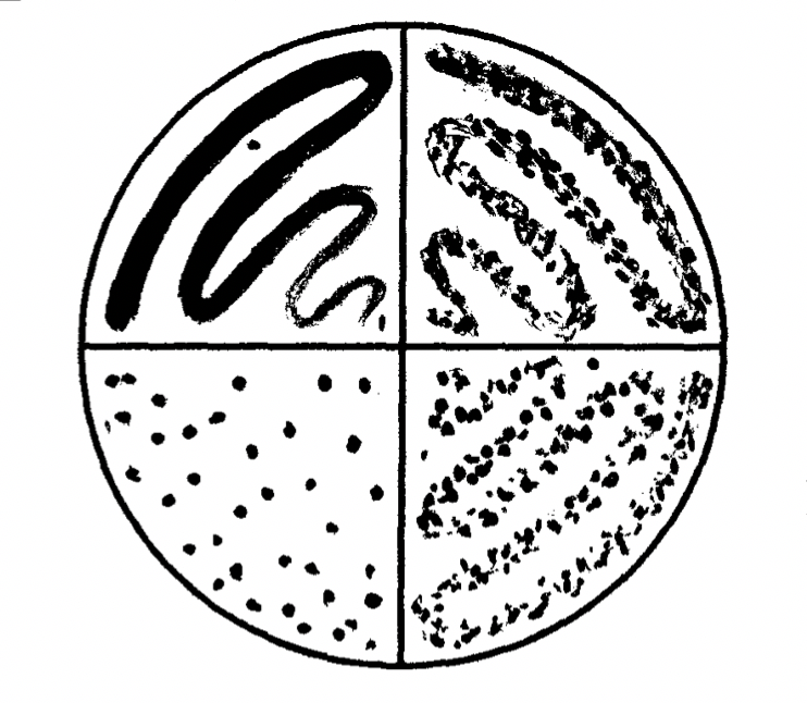 В целях экономии сред и посуды можно пользоваться одной чашкой, разделив ее на сектора, и последовательно засевать их штрихом (метод истощающего штриха). Для этого материал берут петлей и проводят ею ряд параллельных штрихов сначала по поверхности первого сектора, а затем последовательно оставшимися на петле клетками засевают все другие сектора. При каждом последующем штрихе происходит уменьшение количества засеваемых клеток.