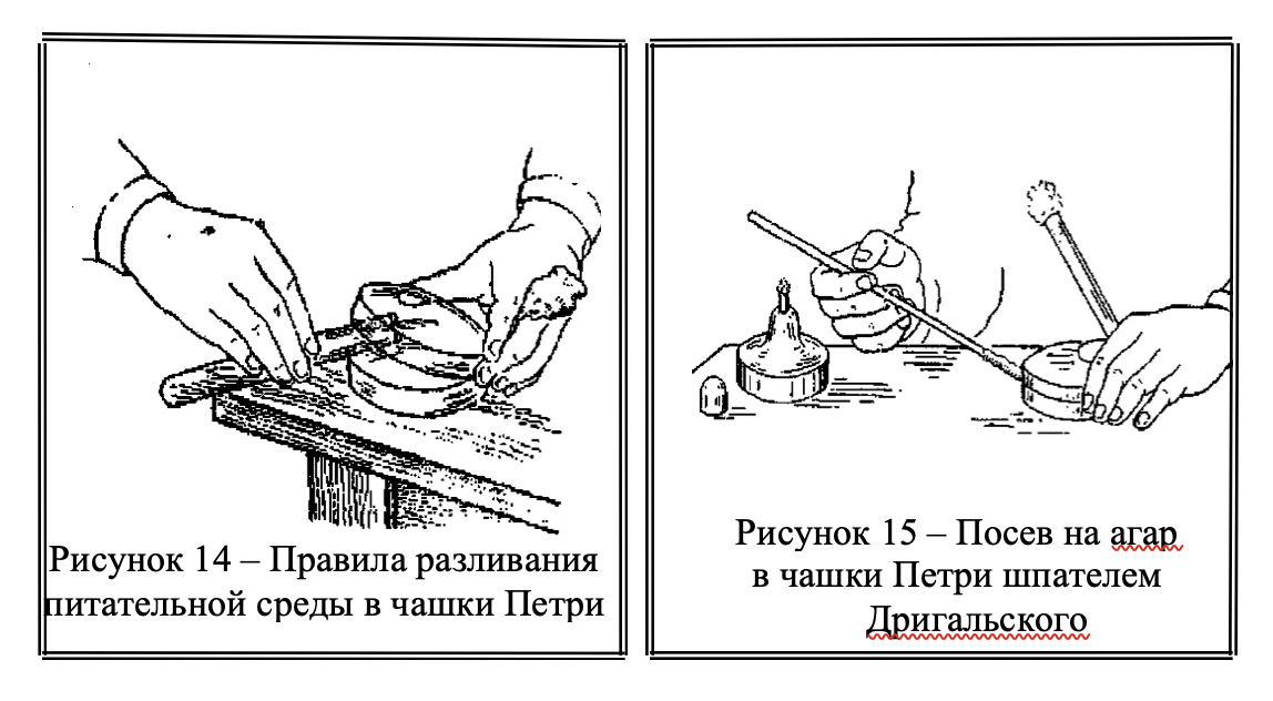 Посев в чашки Петри производят следующим образом: плотную питательную среду в пробирках или колбах расплавляют на кипящей водяной бане, охлаждают до 48–50 0С и, соблюдая правила асептики, разливают ровным слоем толщиной 3–5 мм в стерильные чашки. Посев делают стеклянным шпателем Дригальского или петлей в виде параллельных или зигзагообразных (метод истощающего посева) штрихов.