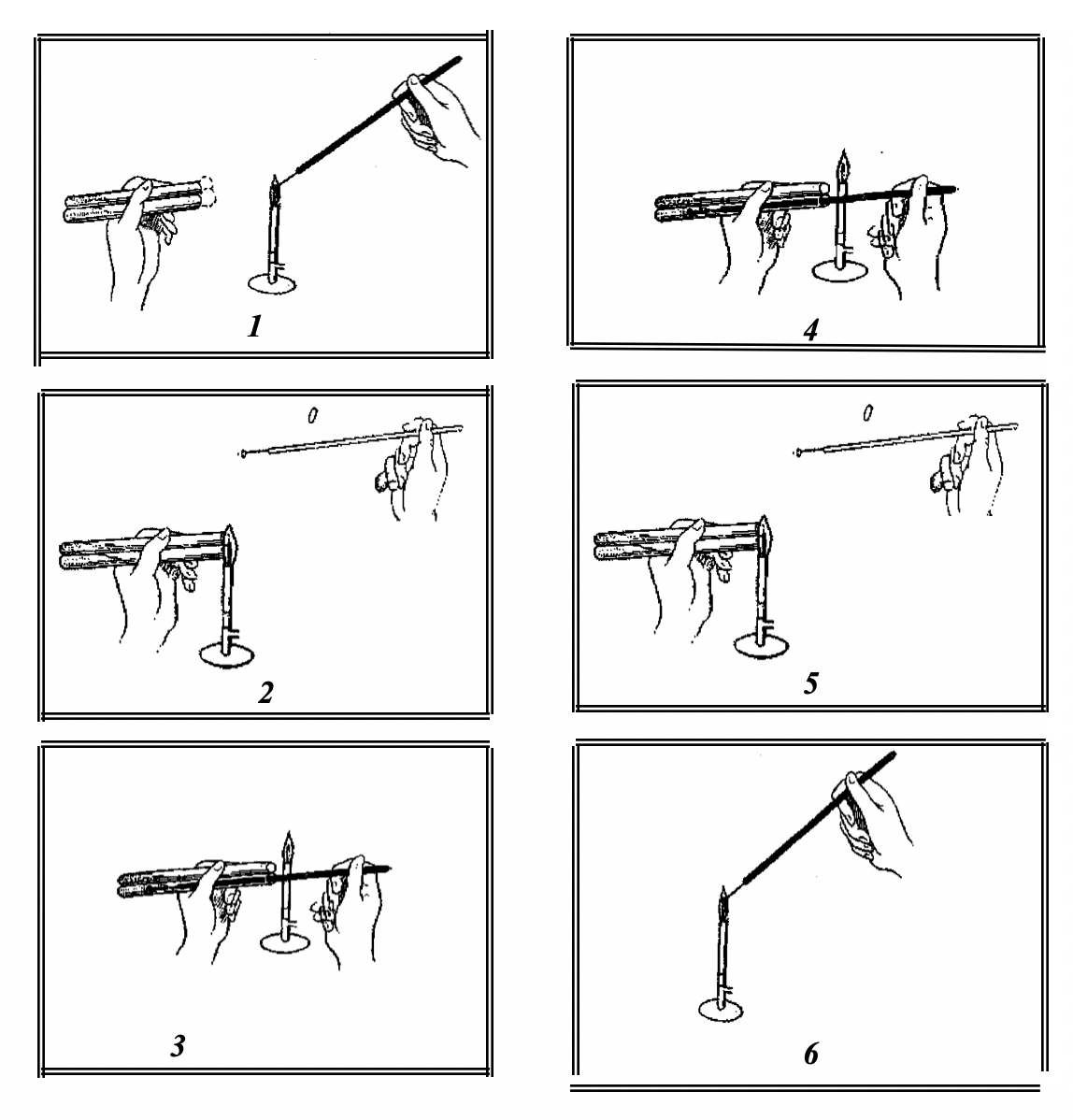 1. Вынимают ватные пробки из обеих пробирок, прижимают их к ладони мизинцем и безымянным пальцами правой руки и обжигают края пробирок. Следят за тем, чтобы пробки не касались посторонних предметов;