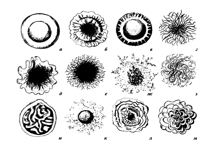 Рисунок 17 – Форма колоний: а – круглая; б – круглая с фестончатым краем; в – круглая с валиком по краю; г; д – ризоидная; е – с ризоидным краем; ж –амебовидная; з – нитевидная; и – складчатая; к – неправильная; л – концентрическая; м – сложная