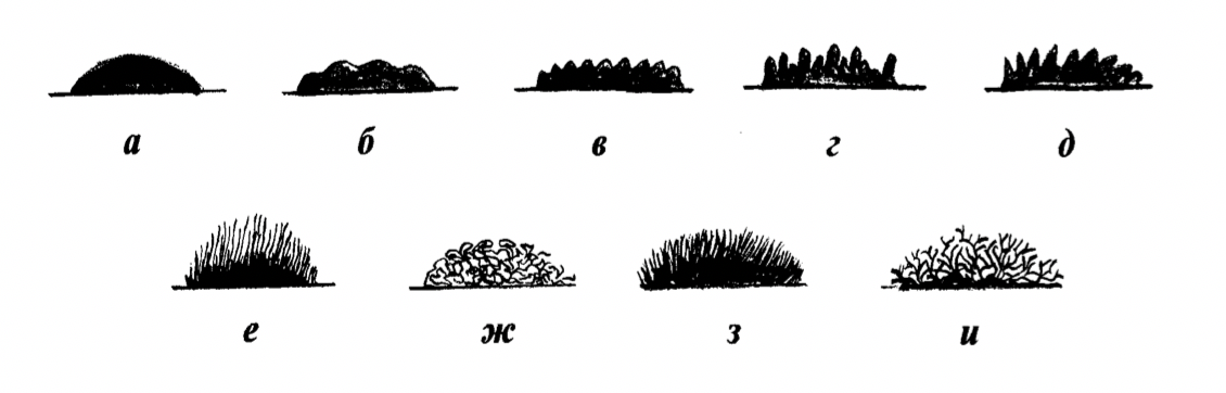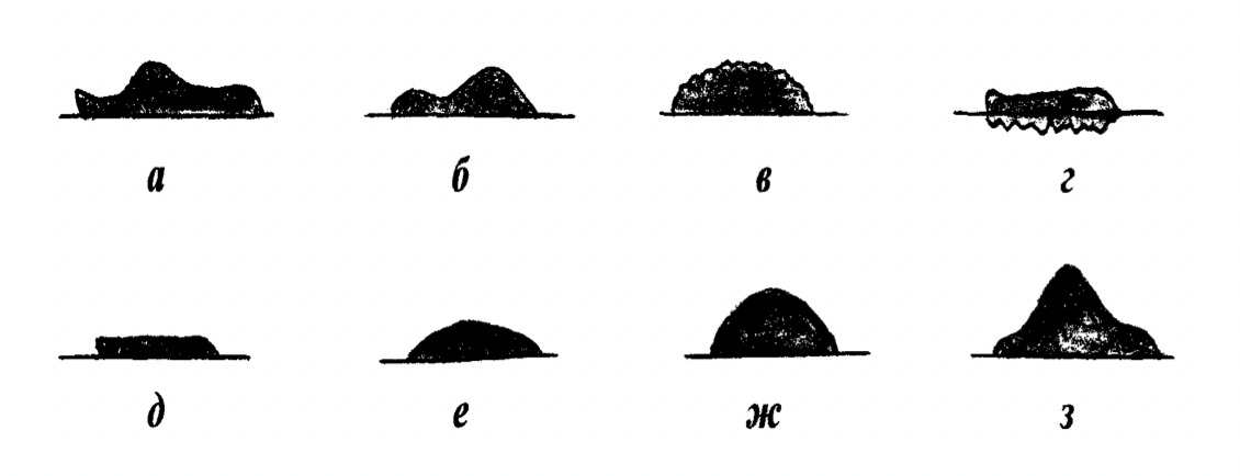 Рисунок 18 – Профиль колоний: а – изогнутый; б – кратерообразный; в – бугристый; г – врастающий в агар; д – плоский; е –выпуклый;ж – каплевидный; з - конусовидный