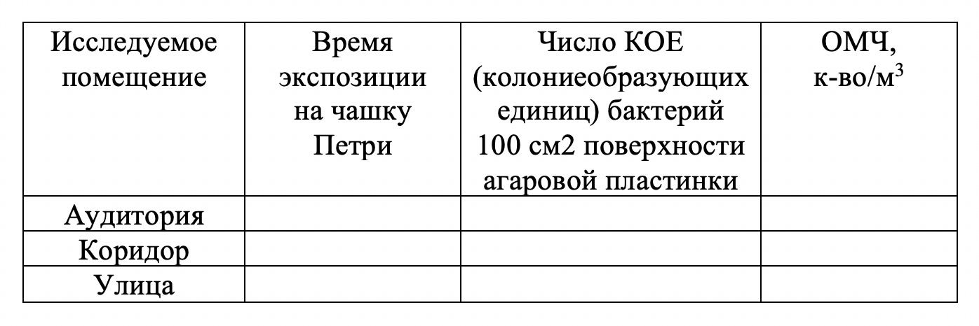 Задание 1. Заложить опыт по определению ОМЧ (общее микробное число) воздуха.