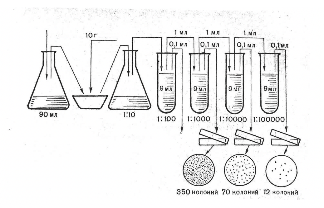 Приготовление почвенной суспензии методом разведения. Соблюдая стерильность, отвешивают 10 г почвы и переносят ее в стерильную ступку. Навеску почвы в ступке увлажняют до пастообразного состояния, добавляя 2-3 мл воды из первой колбы, содержащей 90 мл стерильной воды, и растирают 5 мин пальцем в резиновой перчатке. После растирания почву из ступки переносят с помощью воды во вторую сухую колбу, получают первое разведение – 1/10. Почвенную суспензию в колбе встряхивают в течение 5 мин, дают отстояться 30 с и далее стерильной пипеткой переносят 1 мл почвенной суспензии из колбы в пробирку № 1 с 9 мл стерильной дистиллированной воды, получают второе разведение – 1/100. Подобным образом готовят ряд последующих разведений почвенной суспензии –1/1000, 1/10000, 1/100000 и более в зависимости от предполагаемой численности микроорганизмов (рисунок 20).