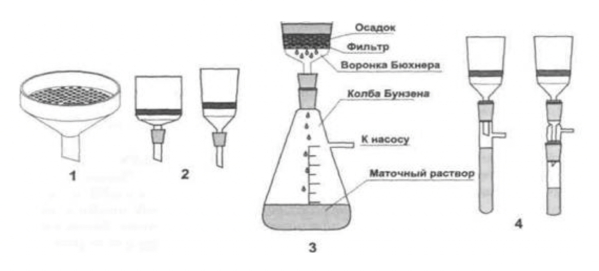 Рисунок 1 – Виды фильтров: 1 – воронка Бюхнера; 2 – фильтры; 3 – колба Эрленмейера с фильтром; 4 – асбестовые фильтры