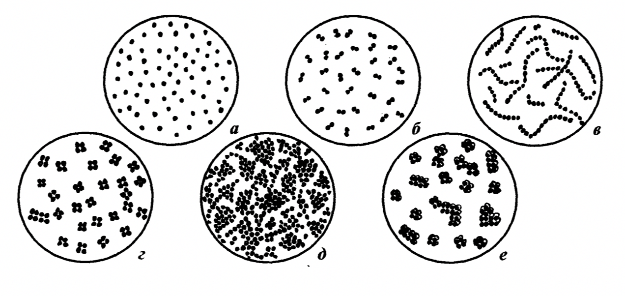 Рисунок 4 – Взаимные расположения кокков: а - микрококки; б - диплококки; в - стрептококки; г - тетракокки; д - стафилококки; е - сарцины