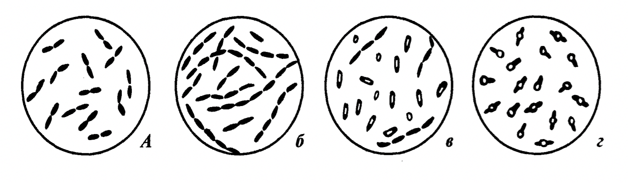 Рисунок 5 – Морфология палочковидных бактерий: а - диплобактерии; б - стрептобактерии; в - бациллы; г - клостридии