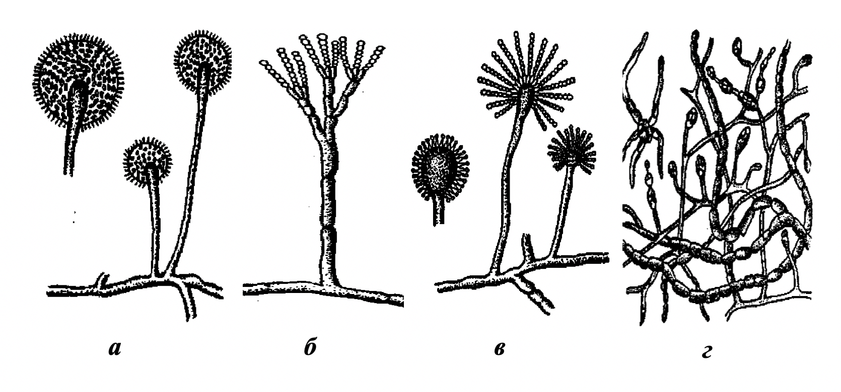 Рисунок 12 – Морфологические особенности грибов различных классов: а - Mucor; б - Penicillium; в - Aspergillus; г - Alternaria