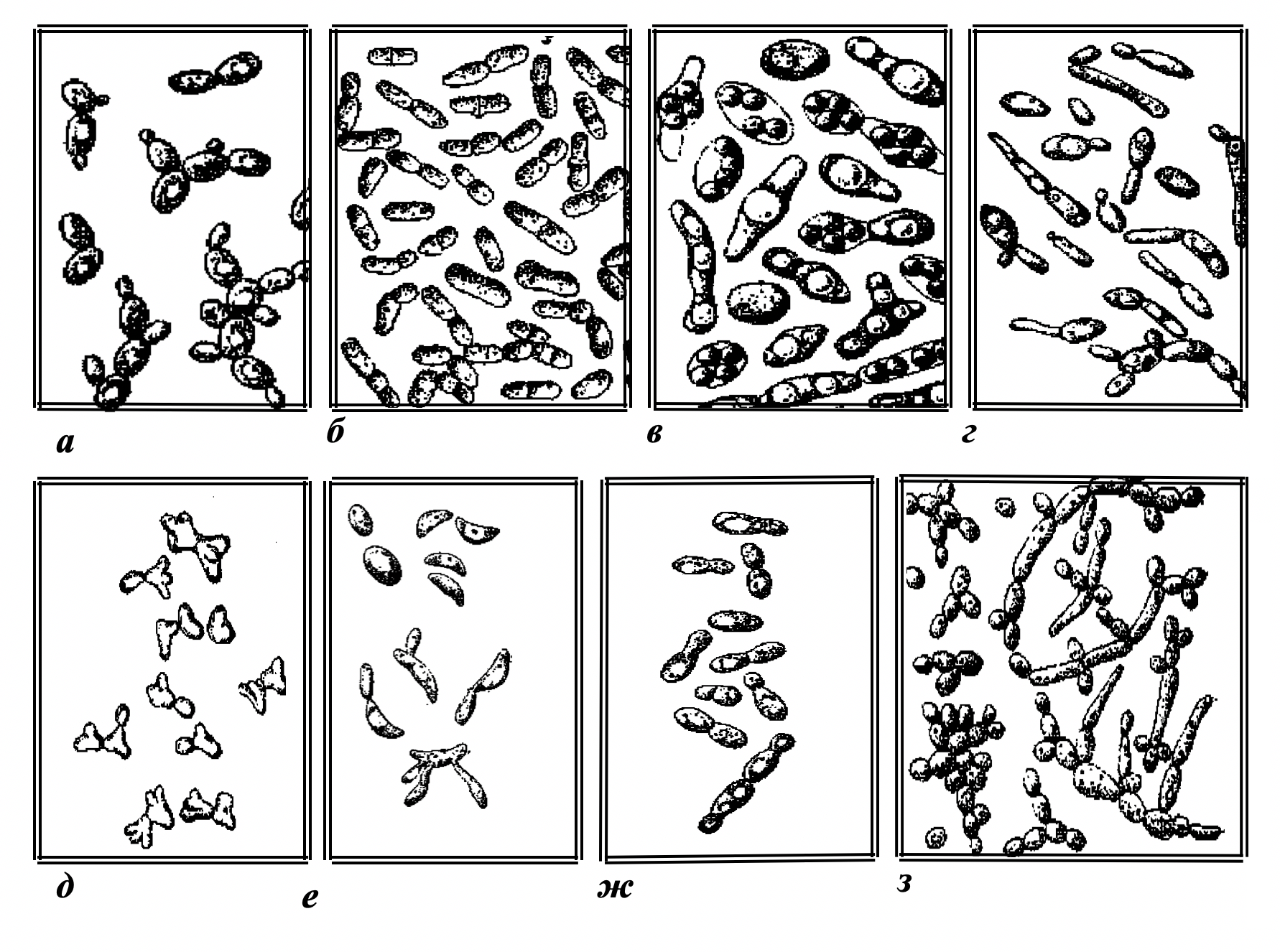 Рисунок 13 – Формы дрожжевых клеток: а – овальная яйцевидная; б – цилиндрическая; в – апикулятная; лимоновидная; г – стреловидная; д – треугольная; е – серповидная; ж – колбовидная; з – мицелевидная