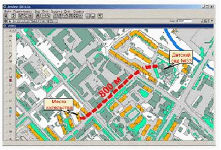 В геоинформационной системе присутствует подсистема управления как географической, так и атрибутивной информации. Пространственный анализ, который включает в себя проверку взаимного расположения объектов, установление закономерностей их распределения, нахождение смежных объектов, измерение расстояния и площади и т.д., проводят с опорой на географическую информацию. Функции семантической (непространственной) обработки предназначены для анализа и управления атрибутивной информацией, рис. 1 Вычисление кратчайшего пути в геоинформационной системе ArcView GIS