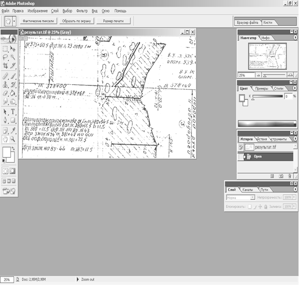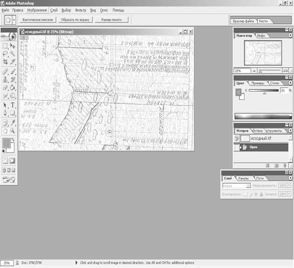 Чтобы убрать серый фон документа, используем фильтр Пыль и затирка, предварительно переведя рисунок из режима Bitmap в режим Grayscale.