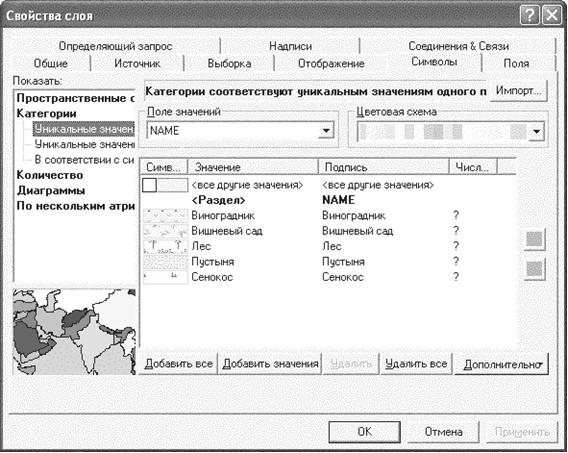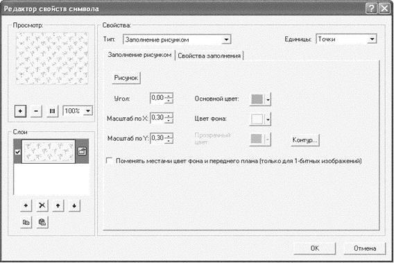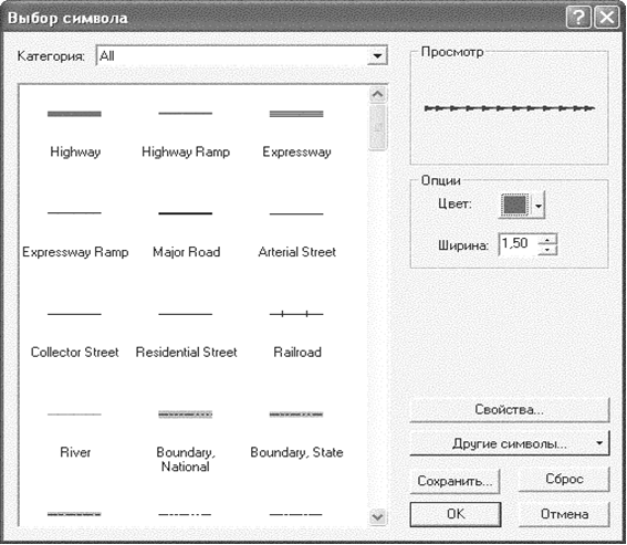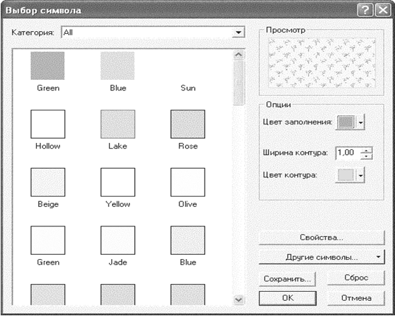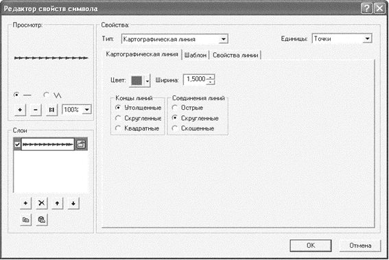 С помощью различных опций редактора символов можно задавать различные параметры объектов карты: слоев, условных обозначений, линий и т.д.