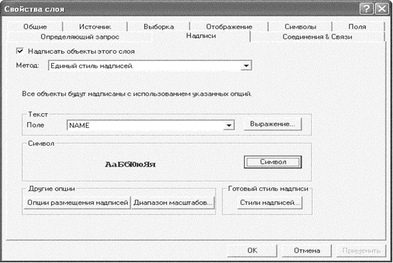 С помощью опций редактора надписей можно задавать параметры текстовых объектов карты.