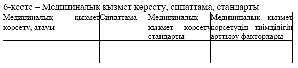 Семинар сабағы қарастырылған сұрақтар бойынша студенттердің баяндамаларын кезеккезегімен тыңдау түрінде өтеді. Медициналық қызмет көрсету стандарты, олардың сипаттамалары кесте 6 ұсынылады.