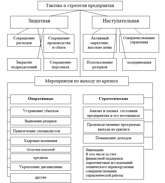 Защитная (оборонительная) тактика направлена на сокращение объемов операционной и инвестиционной деятельности предприятия, привлечение внешней финансовой помощи для соответствующей реструктуризации предприятия с целью сокращения персонала, закрытия отдельных структурных подразделений, уменьшение объемов производства и т.п.