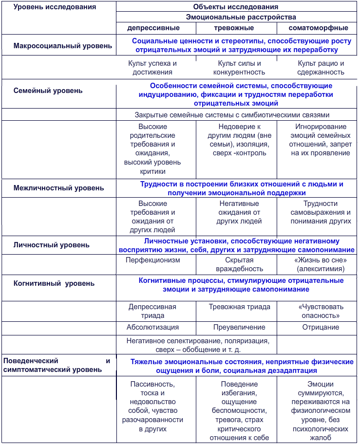 Во многих случаях причинами эмоциональных расстройств являются различные органические и психические заболевания. Есть, однако, причины, которые касаются определенных социальных слоев общества. Такими причинами, являются специфические психологические факторы (табл. 1) и в частности, особые ценности и установки, поощряемые в социуме и культивируемые во многих семьях. Становясь достоянием индивидуального сознания, они создают психологическую предрасположенность к эмоциональным расстройствам, в том числе к переживанию отрицательных эмоций и депрессивным и тревожным состояниям.