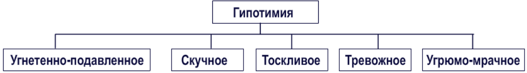Гипотимия является ядром депрессивного синдрома и проявляется в сочетании с замедленностью мышления, двигательной заторможенностью, пессимистическими идеями и соматовегетативными нарушениями. Может наблюдаться истощение физических сил, появление болей, расстройство сна. Усиливается пессимистическое отношение к жизни, снижается самооценка. Обостряются негативные переживания - печаль, вина, тревога, страхи, тоска.