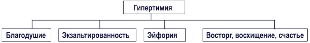 При гипертимических психопатиях, псевдопсихопатиях, эндогенных заболеваниях может наблюдаться повышенное настроение, имеющее различные оттенки: