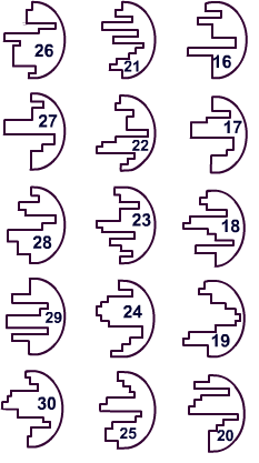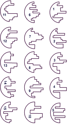 Методика «Совмещения вырезов». Стимульный материал представляет собой два набора по 15 фигур с различными вырезами. Каждой фигуре в первом наборе, расположенном в верхней части листа, соответствует одна фигура из второго набора, расположенного в нижней части листа. При совмещении двух соответствующих фигур получается круг.