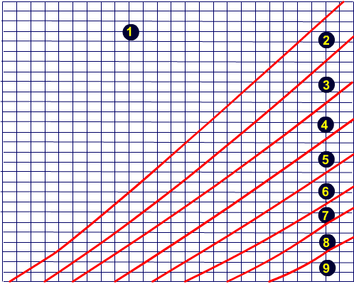 Обработка результатов. При выполнении 5-минутной пробы оценка выставляется в условных баллах по номограмме (рис.), на которой учитывается количество просмотренных колец и количество ошибок. Берется средний результат из двух проб. Особое внимание обращается на изменение продуктивности от минуты к минуте и на то, как изменяется количество ошибок.