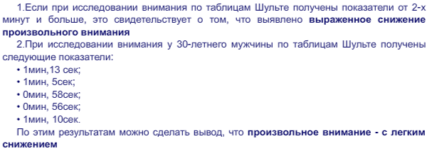 - если испытуемый не превышает временные нормативы по каждой таблице, значит, он способен к хорошей концентрации внимания.