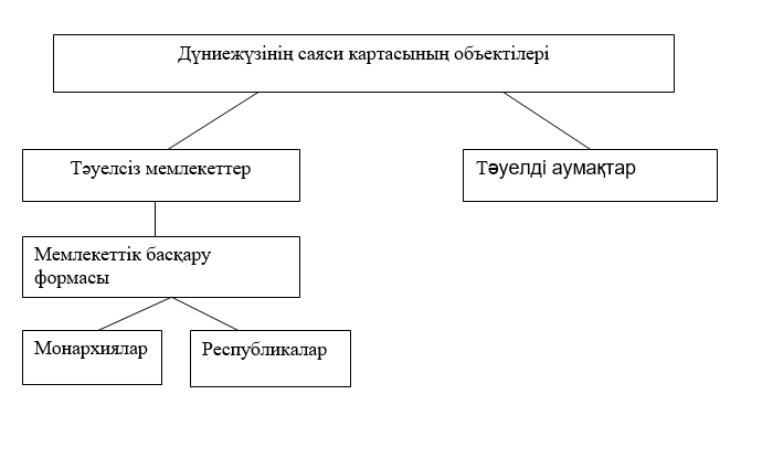 Тәуелсіз мемлекеттер. Өздерінің 6-сызбанұсқадан көріп отырғандай, тәуелсіз елдер мемлекеттік құрылымы мен басқару формалары жағынан әртүрлі болады. Кез келген елдің мемлекеттік құрылымы, яғни мемлекеттің аумақтық ұйымдасу сипаты оның қоғамдық-саяси өміріне тікелей ықпал еткенімен, экономикалық даму деңгейінде шешуші рөл атқармайды. Дүниежүзінің халықаралық деңгейде танылған тәуелсіз мемлекеттерін (олардың саны 193) мемлекетті басқару бойынша монархиялар мен республикаларға бөлінеді.