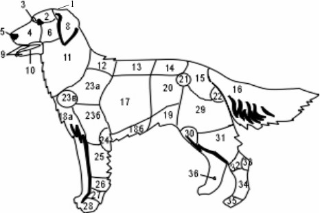 1 – затылок; 2 – лоб; 3 – переход ото лба к морде; 4 – морда; 5 – мочка носа; 6 – скулы; 7 – глаза; 8 – уши; 9 – губы; 10 – зубы; 11 – шея; 12 – холка; 13 – спина; 14 – поясница; 15 – круп; 16 – хвост; 17 – грудь;18 а – передняя часть груди; 18 б – нижняя часть груди; 19 – пах; 20 – маклок; 21 – седалищный бугор; 22 а– лопатка; б – плечо; в – лопаточно-плечевое сочленение; 23 – локоть; 24 – предплечье; 25 – запястье; 26 – пясть; 27 – лапа передняя; 28 – бедро; 29 – колено; 30 – голень; 31 – скакательный сустав; 32 – пятка; 33 – плюсна; 34 – лапа задняя; 35 – прибылой палец