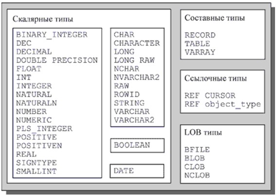 PL/SQL тілі келесі типтер категориясынан тұра алады:
