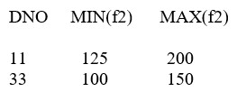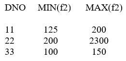 Топтарды пайдалану арқылы таңдау мысалын көрсетейік. dno бағаны тек қана үш мәнге ие 11, 22 және 33. Әр үш топ үшін f2 бағанының минималды және максималды мәні бар: